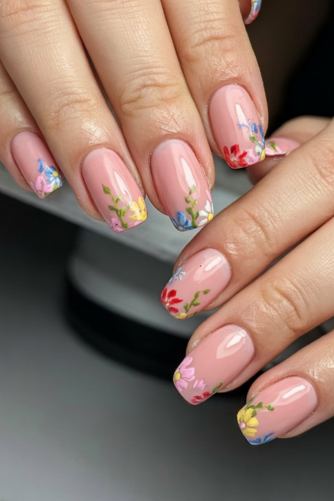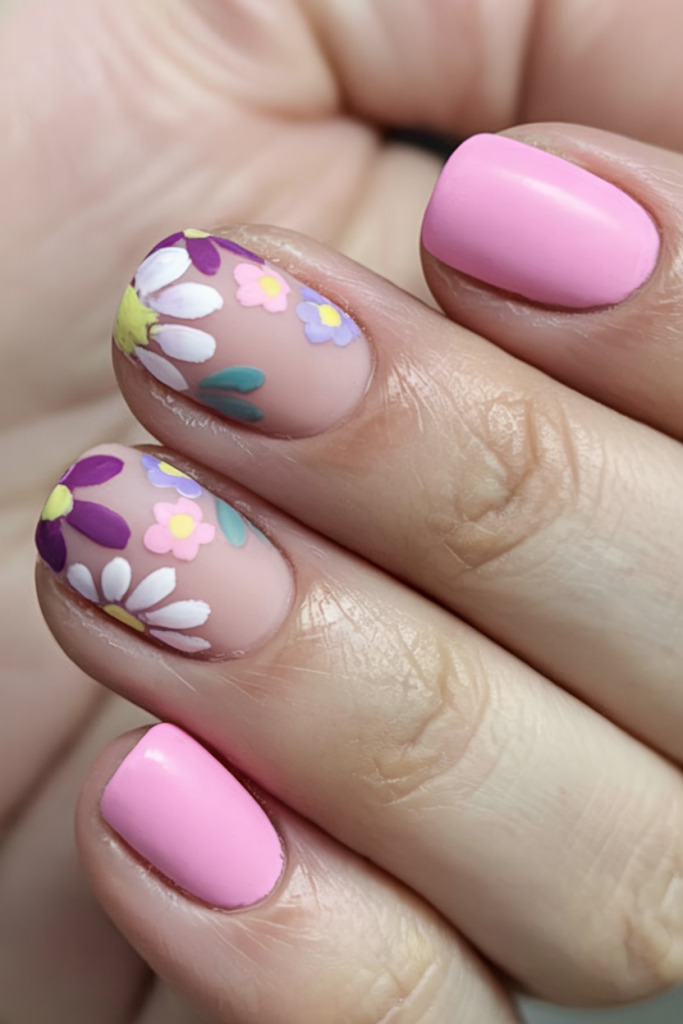 This design is a love letter to pink. Glossy short nails alternate with nude-based tips covered in 3D floral appliqués in pastel purple, yellow, and white. It’s sweet, soft, and timeless—ideal for women who want something feminine but not too loud.