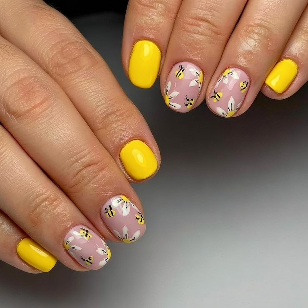 Here’s proof that bold and simple can co-exist beautifully. Bright yellow solids are paired with bee-and-daisy accents on a blush background, making this short, square style equal parts cute and punchy. One of the more casual sets in this roundup, it’s still endlessly stylish.