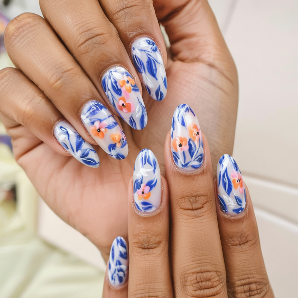 Channeling fine china vibes with a tropical twist, this almond design combines elegant blue leaves and bold orange flowers painted on a translucent base. The brushwork is intentional and expressive, giving this art piece serious gallery-worthy energy. A perfect fit for high-style summer outings.