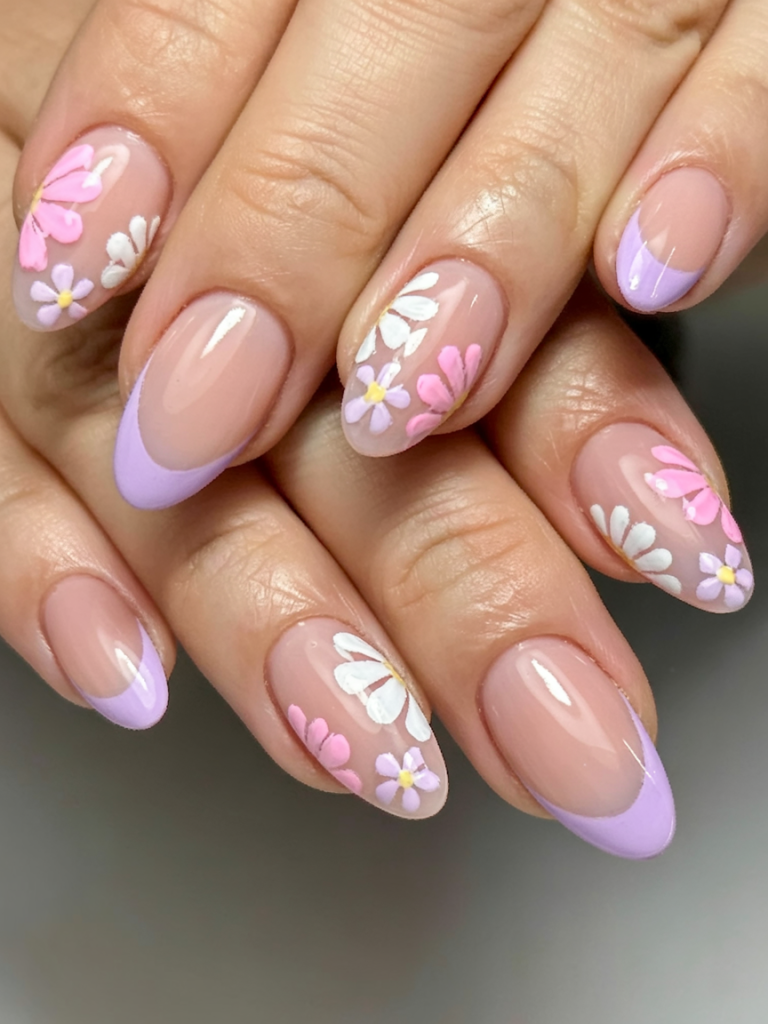 One of the most romantic sets of 2025, this look reimagines the French tip with a lilac twist. Soft purple arcs frame the top of almond nails, while miniature 3D blossoms dance across nude bases. It’s youthful yet elegant and ideal for bridal showers or anniversary dinners.