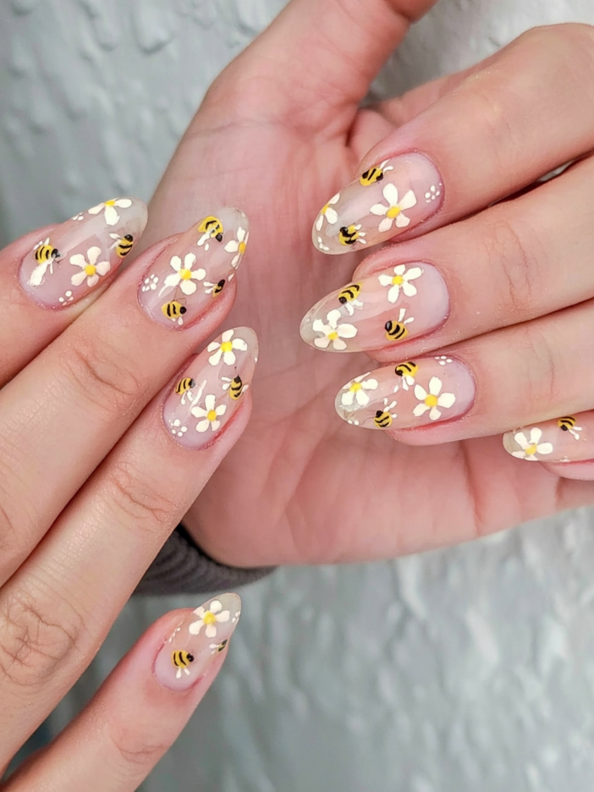 Whimsical and oh-so-fresh, this almond shape manicure is covered in hand-painted white daisies and buzzing bees. The negative space and transparent base offer an airy effect that makes the yellow and black pop without overwhelming. It’s playful yet polished—exactly what a summer garden party calls for.