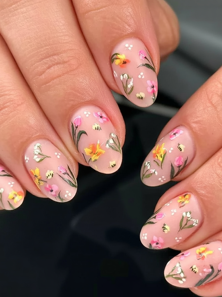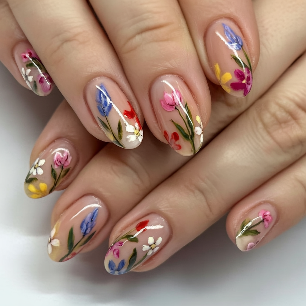 If you’re someone who appreciates artistry in every brushstroke, this detailed floral design is for you. Featuring a wild garden of blossoms in blue, lavender, red, and yellow on a sheer base, this manicure mimics the elegance of botanical illustrations. Each flower looks hand-painted, making this design one of the most art-forward of the bunch.