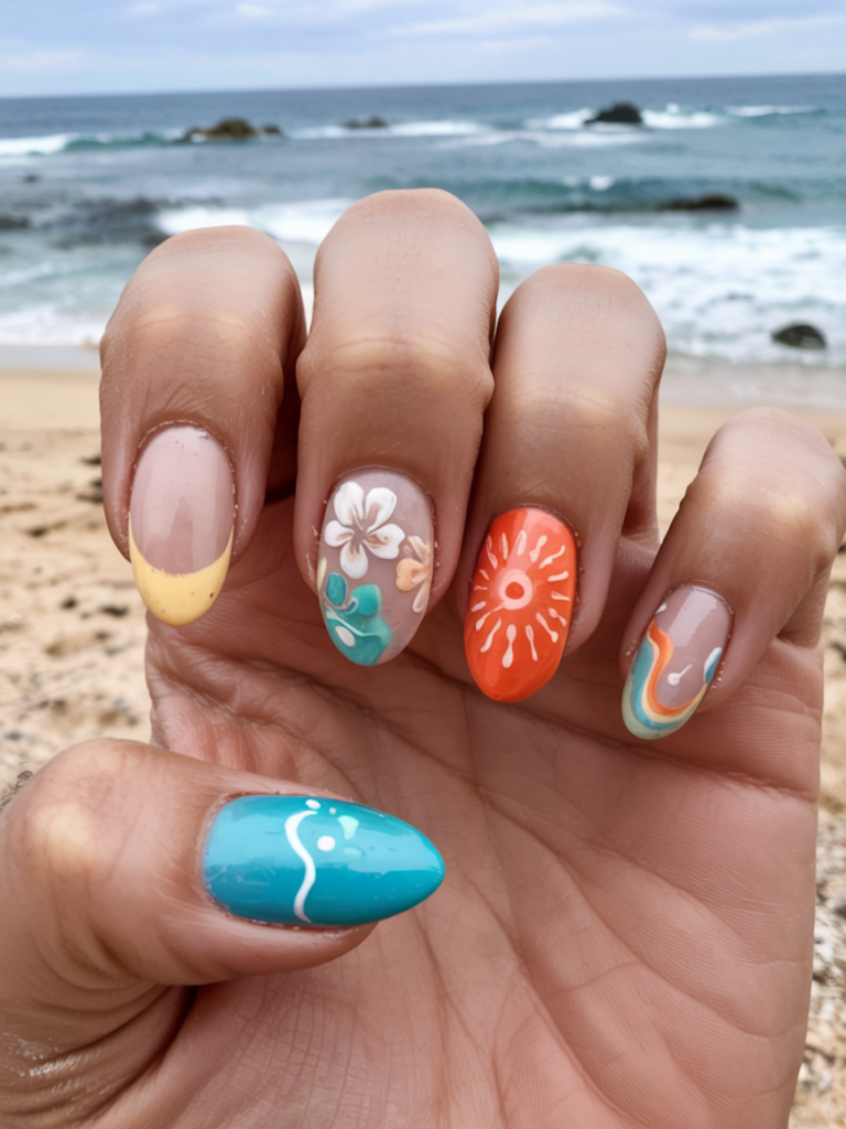 You can almost hear the ukuleles and ocean waves with this almond-shaped, beach-perfect nail design. The combination of turquoise, sandy neutrals, sunset orange, and sunny yellow evokes a tropical vacation in a bottle. Each nail tells its own story: a radiant orange sunburst, a plumeria bloom, wave swirls, and abstract accents—all brought to life with acrylic precision and fine art details.