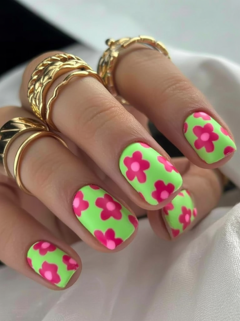 Hello, Designs 2025 nostalgia! This striking look features matte square nails in lime green decorated with bold pink flowers in a repeating retro pattern. It feels pulled straight from a groovy 70s summer, but make it Gen Z chic. The simplicity of the design gives it that cool girl edge.
