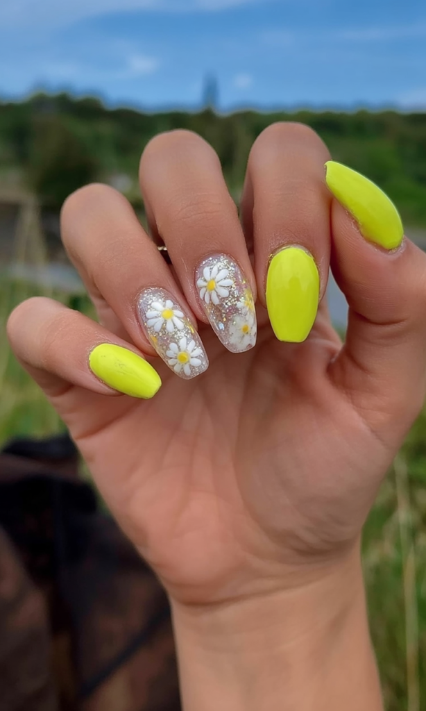 Sunlight in nail form. This coffin-shaped manicure combines glossy, acrylic yellow nails with transparent glitter tips blooming with daisies. The sparkling backdrop adds a fun, almost ethereal touch to the classic flower style. This one’s made for women who want a statement look without going over the top.