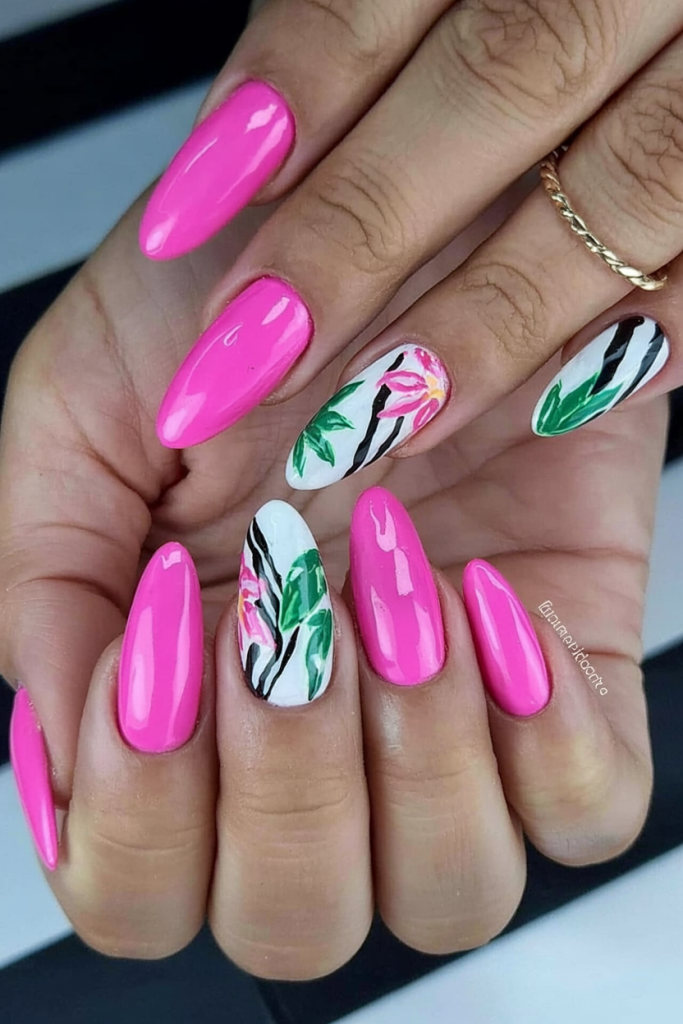This hot pink and jungle-themed manicure gives major vacation energy. Painted on almond shaped nails, it pairs vibrant floral art with zebra-like stripes and leafy greens. It’s a maximalist dream and perfect for anyone not afraid to stand out.