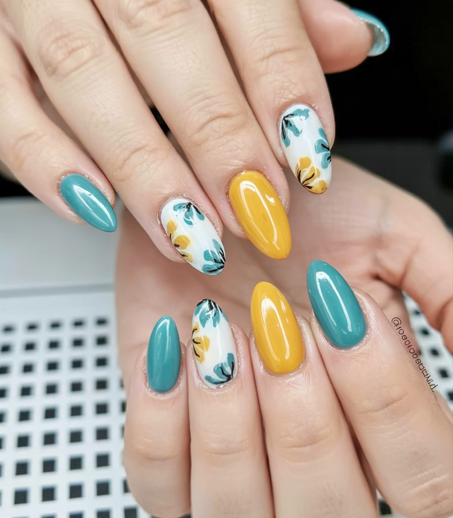 This modern color-blocked look merges mustard yellow and teal solids with floral art in a watercolor effect. The petals—painted on a clean white base—balance edgy and elegant, especially on these almond nails. It feels like something straight off a nail tutorial from a Paris runway show.