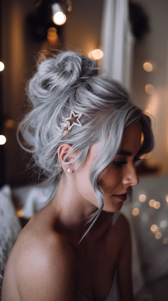 Ideal for weddings, galas, or just feeling glam on a Tuesday. The sparkly star hairpin adds a whimsical finishing touch. This one’s for those who want classy, unexpected ideas for dark hair that still feel luxurious.