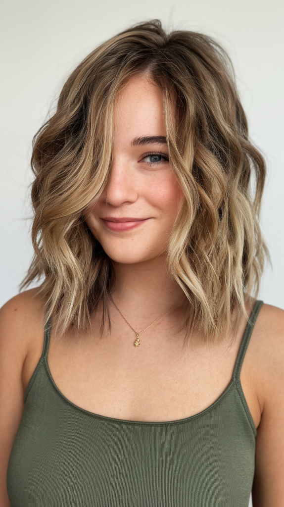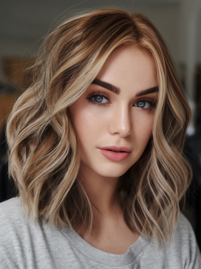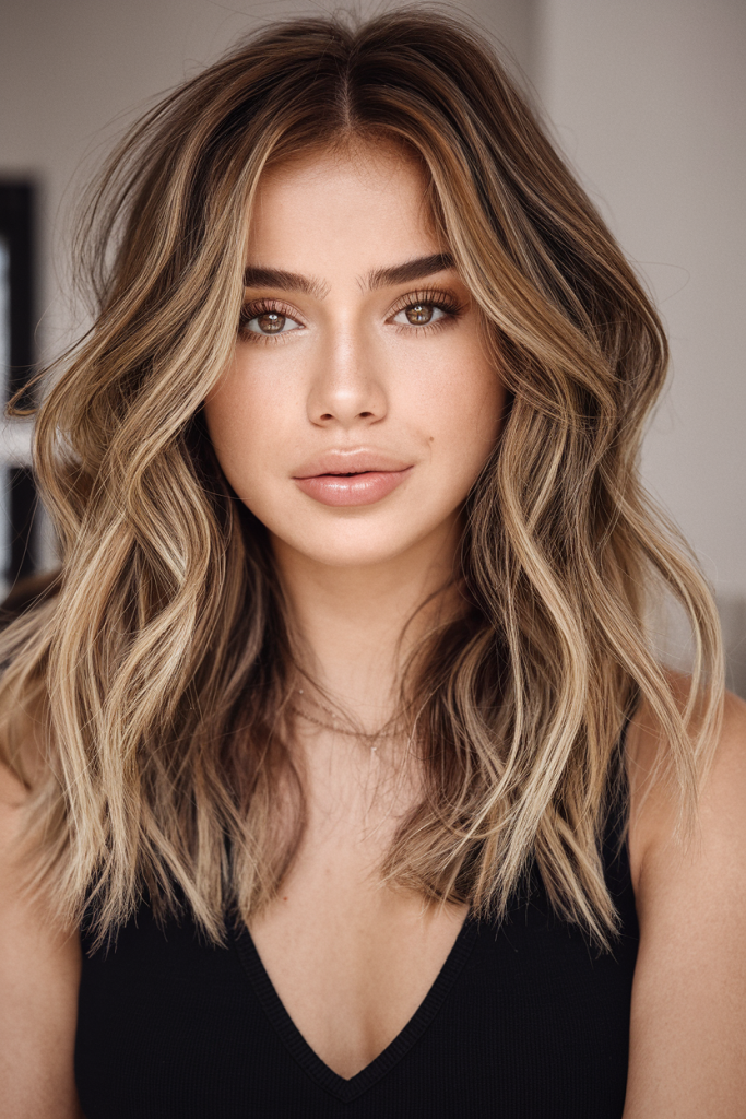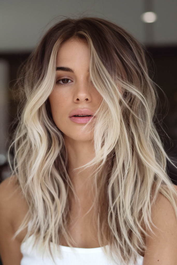 This mid-length wavy style features a well-blended dark root that melts into light ash blonde mid-lengths and ends. The peekaboo highlights and subtle ombré make it a standout 2025 trend without screaming for attention.
