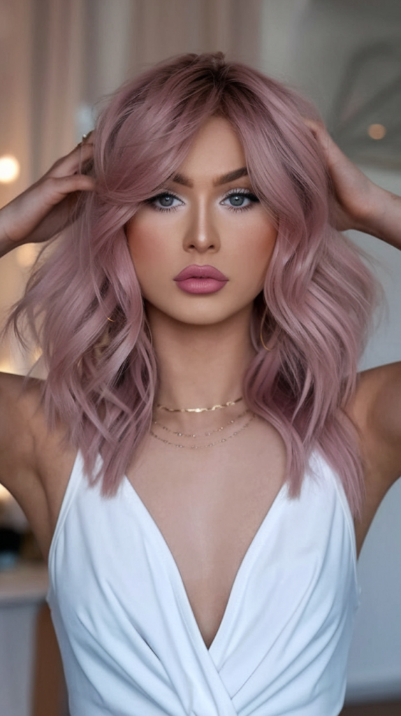 This shoulder length hairstyle in soft rose-mauve is proof that solid color doesn’t have to be boring. It’s flirty, feminine, and very 2025. The soft bend in the styling adds volume and keeps things relaxed and fresh. Think red carpet meets summer rooftop party.