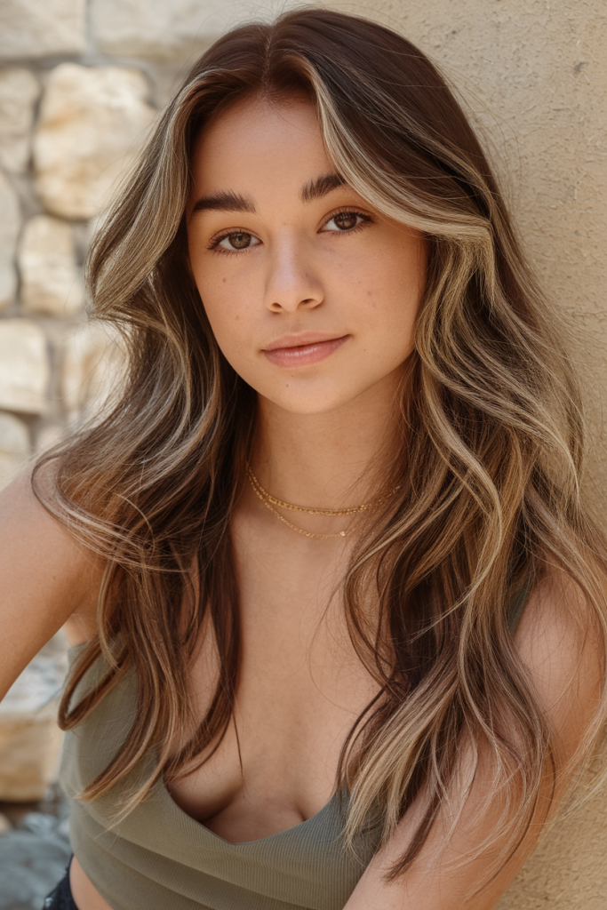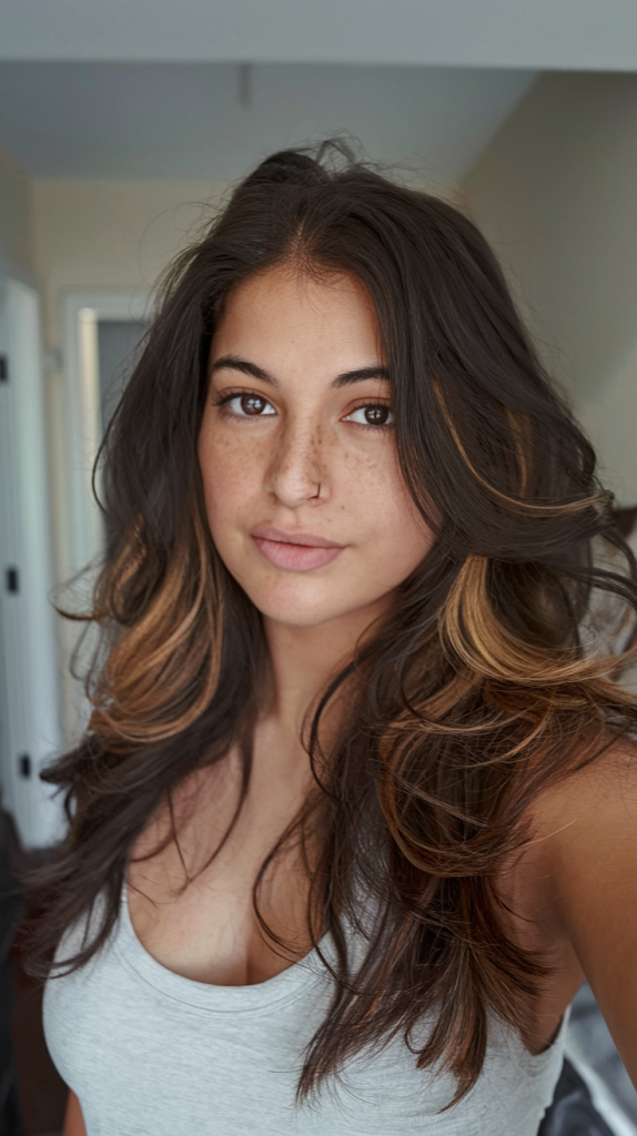 It’s a great pick for brunettes who want an update without full color transformation. These highlights enhance the face and add brightness without overpowering the natural beauty of deeper tones. Perfect with olive tops and layered necklaces for that sun-kissed summer vibe.