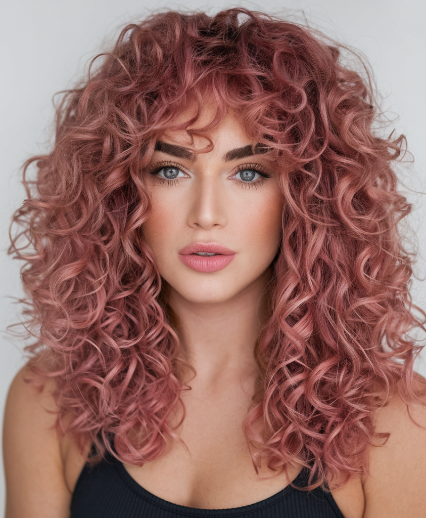 This curly rose gold masterpiece is a bold statement wrapped in softness. The structured curls give volume and movement, while the rich pink undertone keeps it rooted in fun femininity. With full bangs and defined coils, this look channels retro glamour with a modern twist.