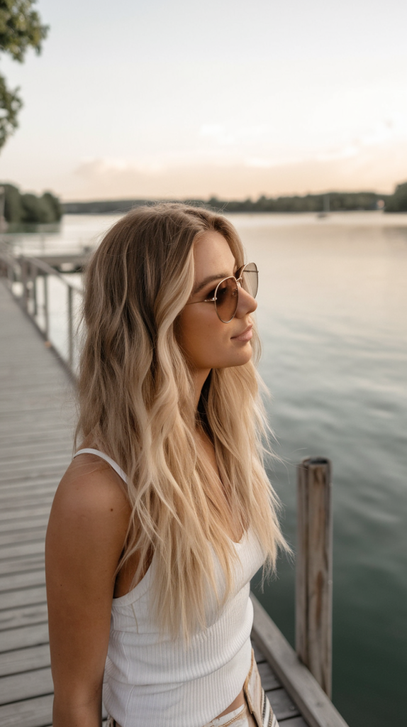 Perfect for blondes who love a natural-looking glow-up, this style pairs beautifully with white tanks, flowy pants, and vintage sunglasses.
