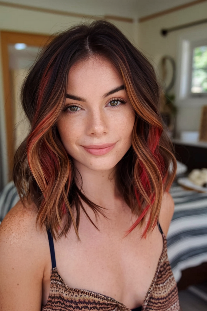 This shoulder length cut is pure summer attitude. A rich, dark brunette base gets a dynamic lift from peekaboo highlights in warm copper and bright cherry-red. These streaks elevate the classic bob into something undeniably funky and modern—perfect for brunettes who want to break away from the expected.