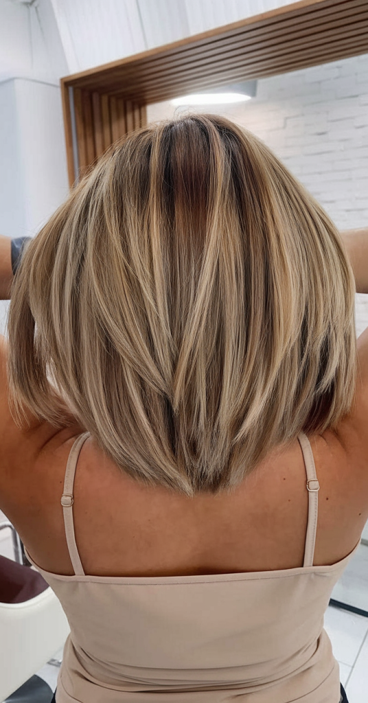 A standout 2025 trend for blondes, this medium length hairstyle features a root melt in smoky brunette that fades seamlessly into icy blonde ombré ends. This color pattern is subtle yet striking, offering the dimension of dark roots without harsh lines.