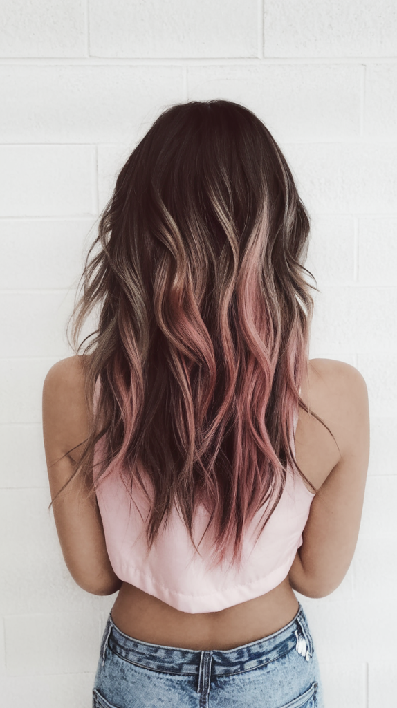 This is one of the most fun and edgy color statements of summer 2025. A deep brunette base fades into soft, dusty rose lengths for a rainbow-adjacent vibe that’s more elevated than flashy. The transition is smooth and romantic, and the tone works beautifully on dark hair.