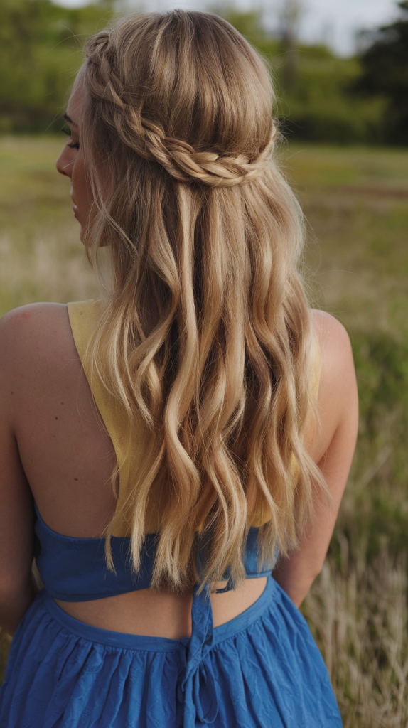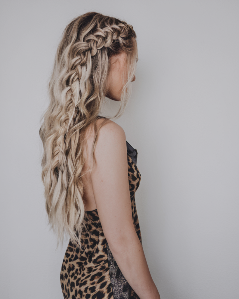Start your braid near the part and gradually work across the side of your head, dropping a strand each time for that “waterfall” effect. Use a wand to curl the loose hair after braiding. This works beautifully with balayage or highlighted hair, adding depth and shimmer.