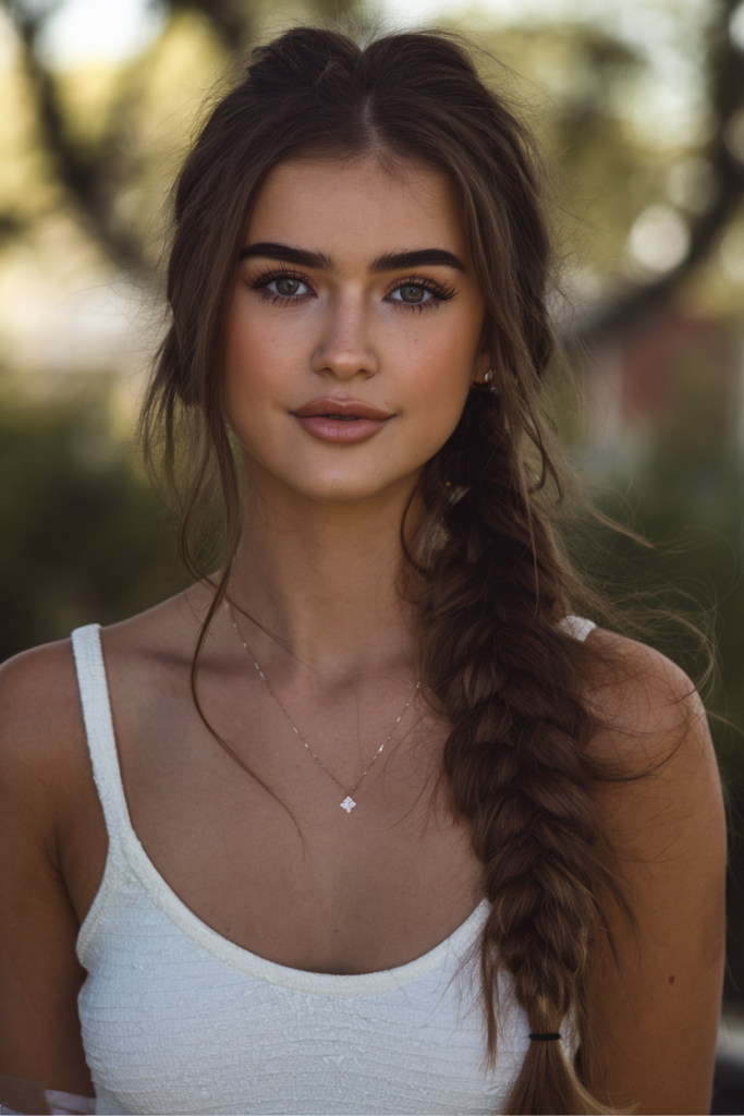 Part your hair slightly off-center, gather it over one shoulder, and loosely braid all the way down. Secure with an elastic and gently tug the sides for fullness. Spray a bit of dry shampoo to create grip and volume at the crown. Pair with breezy dresses and minimal makeup.
