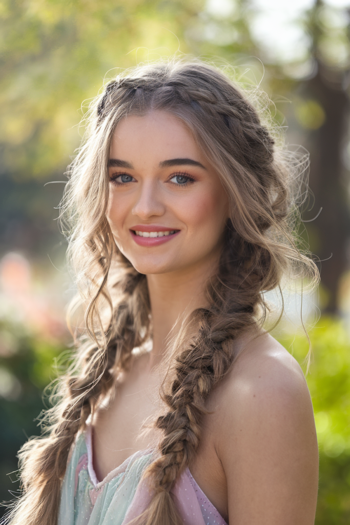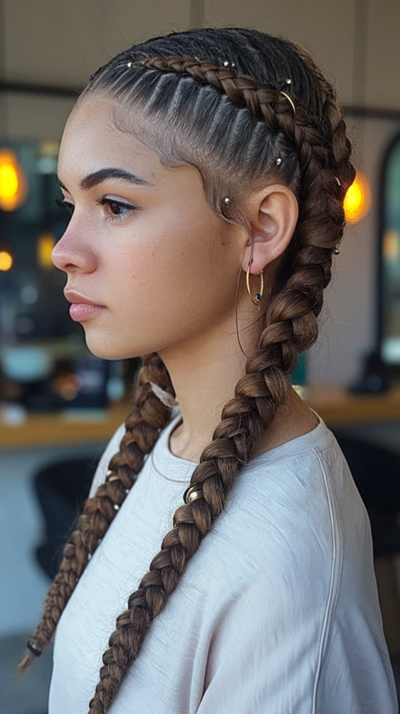 Double braids return with a vengeance in this ethereal take, featuring lightly undone sections and soft waves underneath. It brings together a touch of fairy tale charm with Gen Z edge. Perfect for long hair or medium length, this braid style is universally flattering.