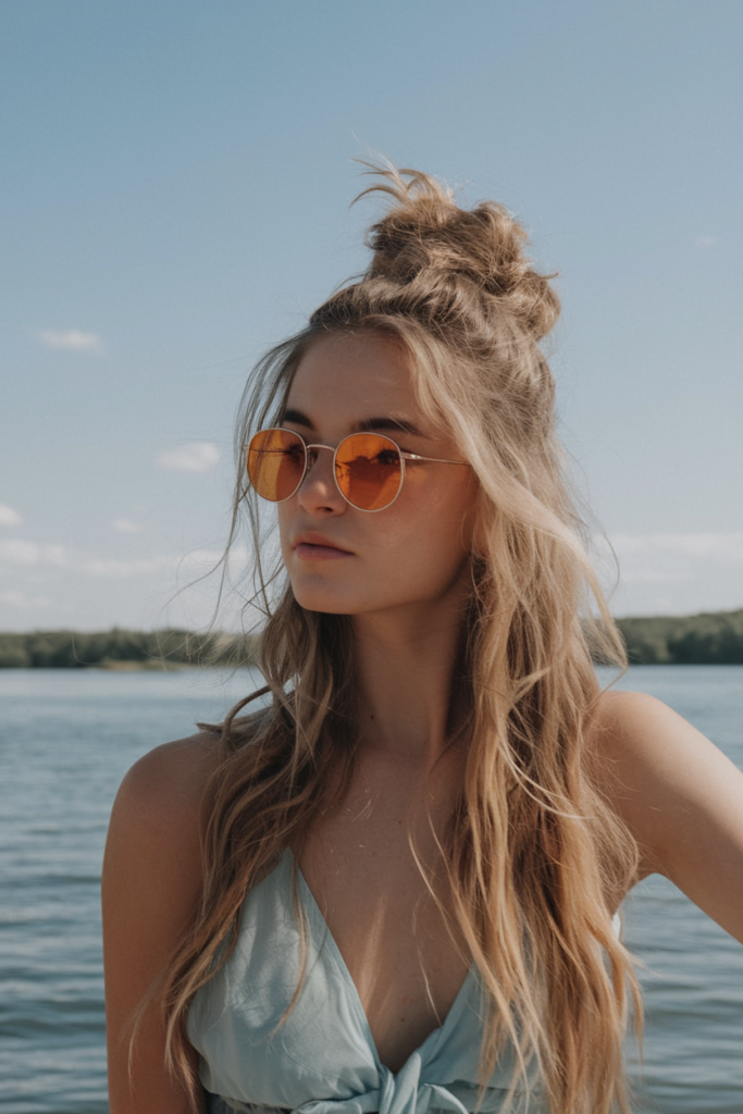 The messy half up half down top knot is the definitive trendy look for 2025. It’s laid-back yet stylish, making it perfect for casual lakeside hangs or beach bars. This hairstyle shines on medium hair or long hair and embraces the flyaway aesthetic.