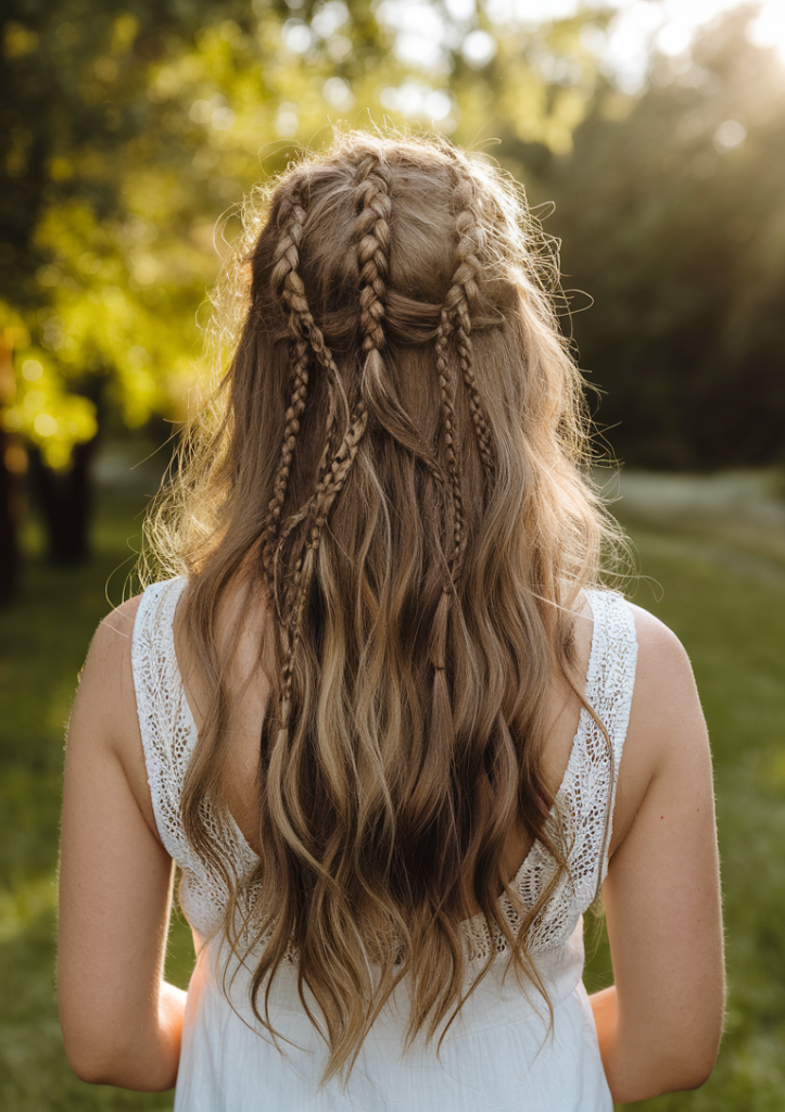 A mix of micro braids and beachy waves gives off major goddess energy. It’s a beautiful braid style that balances intricacy and ease. Works best for long hair and can be worn for everything from casual strolls to midsummer festivals.