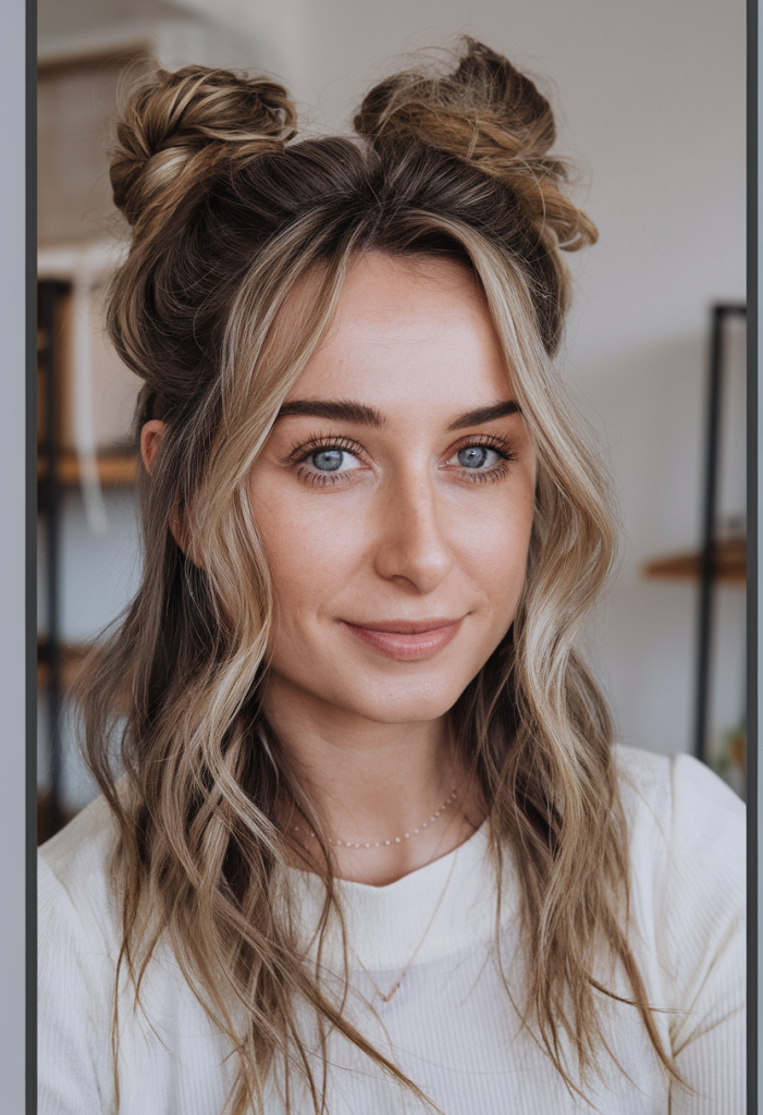 Space buns aren’t just for festivals anymore—this half up half down version is taking over 2025 as one of the most playful and trendy hairstyles. It’s perfect for medium hair or shoulder length textures that want a bit of flair without too much effort.