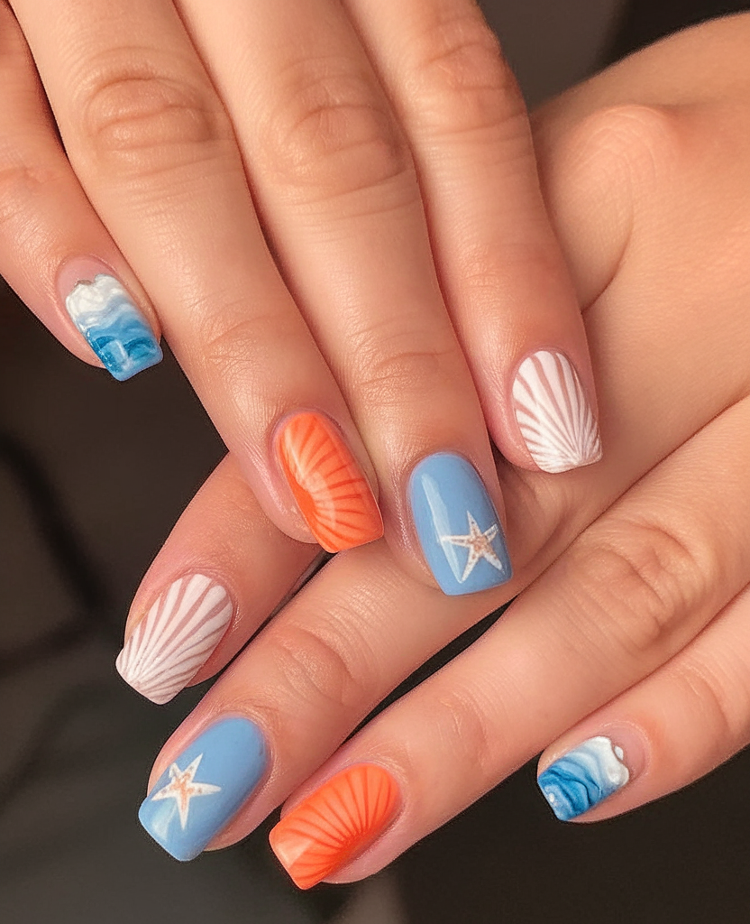 Think beach getaway but make it art. This look features short nails painted in alternating hues of sky blue, coral, and white, with hand-drawn starfish and seashell motifs. It’s a simple yet cute tribute to your favorite ocean views, ideal for casual brunches or coastal vacations. The square nail shape provides a youthful, fresh vibe that works perfectly for 2025 trends leaning into playful details.