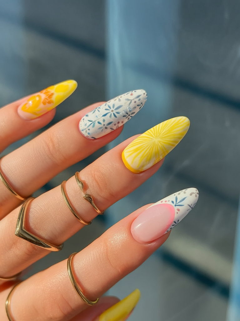 This intricate look blends Japanese and Indian pattern motifs with vibrant summer hues. Yellow, white, and navy dominate the color palette, each nail offering a unique story with floral and abstract designs. The almond nail shape adds length and elegance, balancing ornate patterns with a clean silhouette.