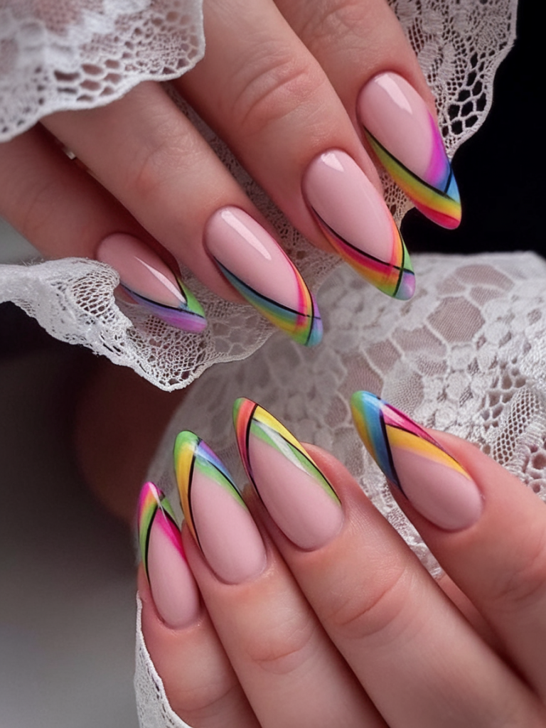 A chic twist on classic French tips, this oval nail look features a nude base with diagonal, rainbow-hued edges. Black lines cut through each arc of color, adding sophistication and a graphic edge. A gorgeous choice for those who adore minimalist but playful designs 2025.
