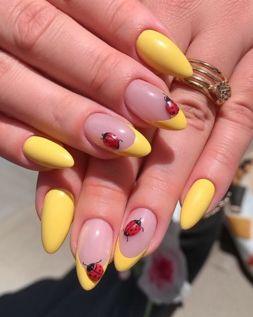 12. Ladybug Yellow Almond Nails
