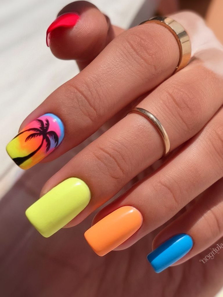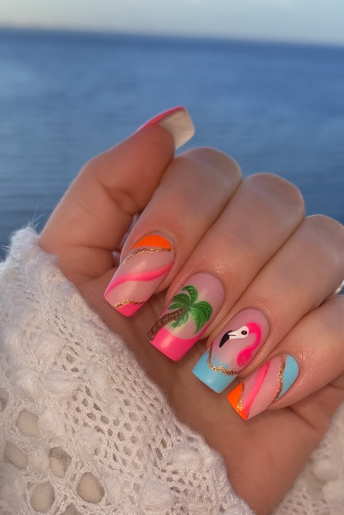 Mixing a tropical sunset with solid color punches, this design features a vibrant beach scene paired with orange, yellow, and blue. The square nail shape makes it bold yet wearable. It’s a great pick for those who love merging art and minimalism in their style.