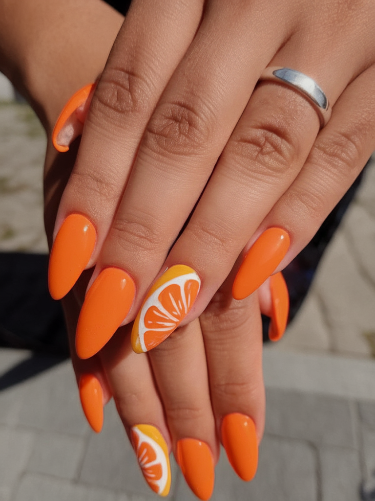 Orange you glad these nails exist? With full orange polish and sliced citrus art accents, this juicy design is a top pick in 2025 short nail designs. The almond shape keeps it trendy and flattering, while the bright colors scream summer.