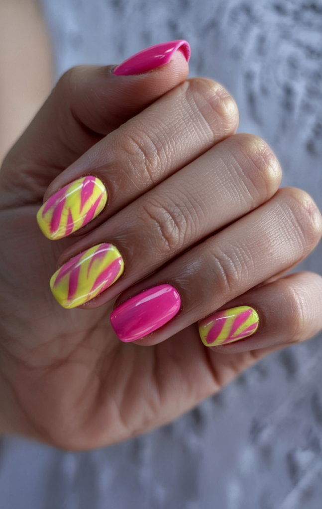 This graphic neon design fuses indie and boho vibes with a burst of electric pink and yellow. The sharp contrast and quick-strike motif are ideal for trendsetters keeping their style current in 2025. The short nails keep it practical and edgy.