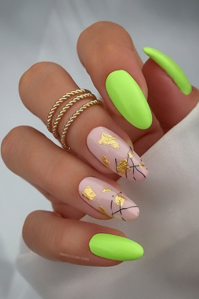 Bold meets elegance in this neon green and blush pink combo. The accent nails feature delicate gold foil designs paired with fine abstract black lines, balancing the brightness with a luxe feel. The almond nail shape adds sophistication, while the neon offers a daring pop—perfect for those looking to make a fashion statement at summer parties.