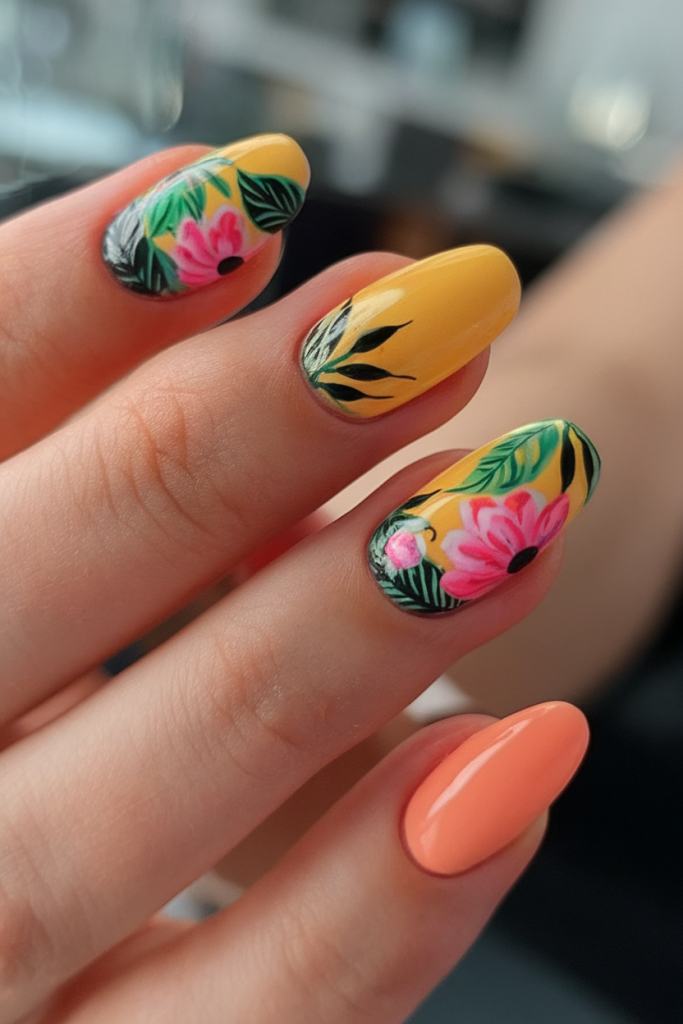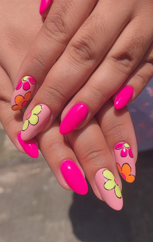 This set combines nostalgia and boldness with hot pink polish and oversized cartoon flowers in lime, orange, and yellow. The playful florals on a nude base evoke a ‘70s boho spirit while the almond shape keeps it current and flattering. An excellent choice for weekend festivals or a standout office look.