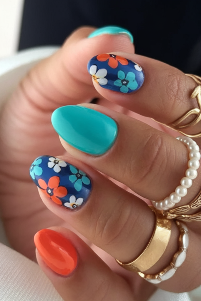 A fun tribute to retro designs, this look uses bold flower patterns in white, orange, and aqua against a deep navy base. Paired with solid teal and orange nails, this round shape feels both nostalgic and modern. Perfect for lovers of cute, boho-inspired looks with a splash of color.