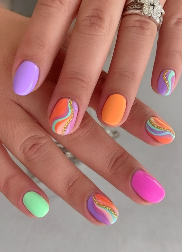 This design screams retro revival with a 2025 twist. Fluid, wavy lines in orange, purple, teal, and gold glide across the nails like a groovy daydream. Each nail showcases a different combo, keeping it eclectic and vibrant. This look channels indie and grunge energy, with a round shape to keep it wearable and low-maintenance.