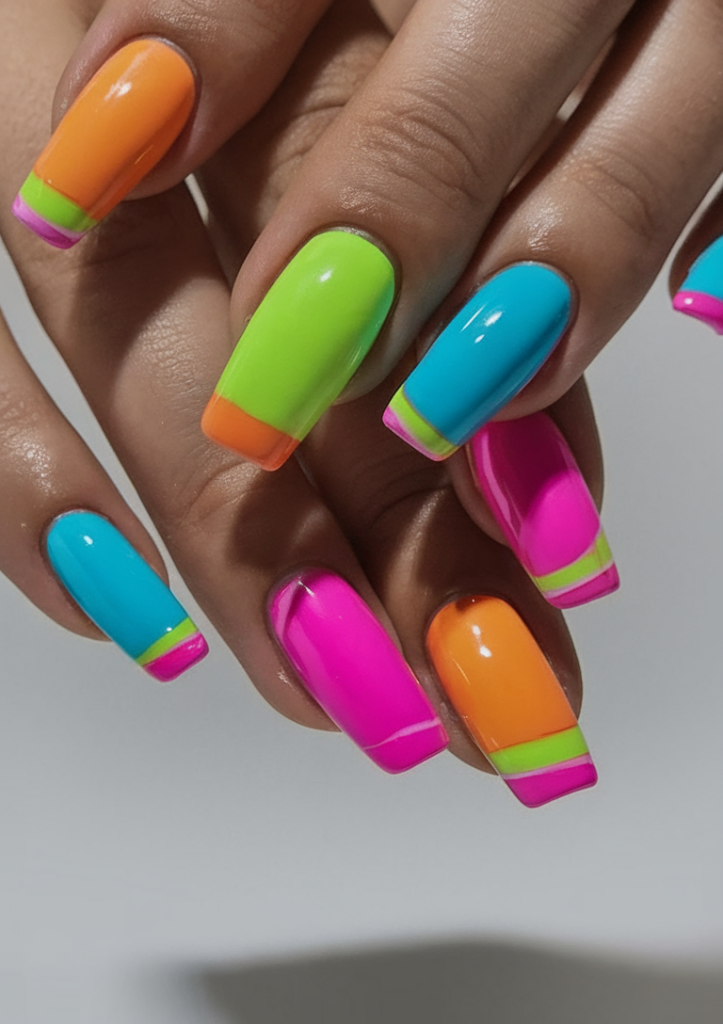 A high-impact look for the bold-hearted. This modern twist on the French manicure swaps classic white for neon block color tips—electric orange, lime, pink, and teal. The square nail shape keeps the design structured and edgy. Perfect for women who aren’t afraid to push the boundaries and embrace the most vivid 2025 trends.