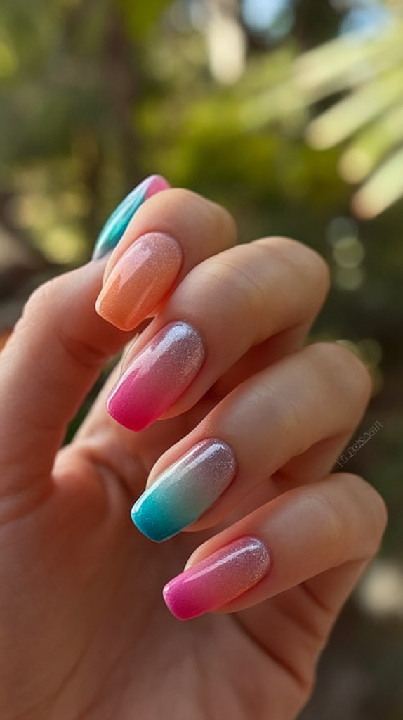 For those who love elegance with a splash of color, this pastel ombre design offers a refined take on summer nail art 2025. Each nail fades seamlessly from one hue to another—peach, pink, aqua, and violet—with a subtle shimmer overlay. These minimalist nails are incredibly versatile and give a soft, feminine finish, especially flattering on round shapes.