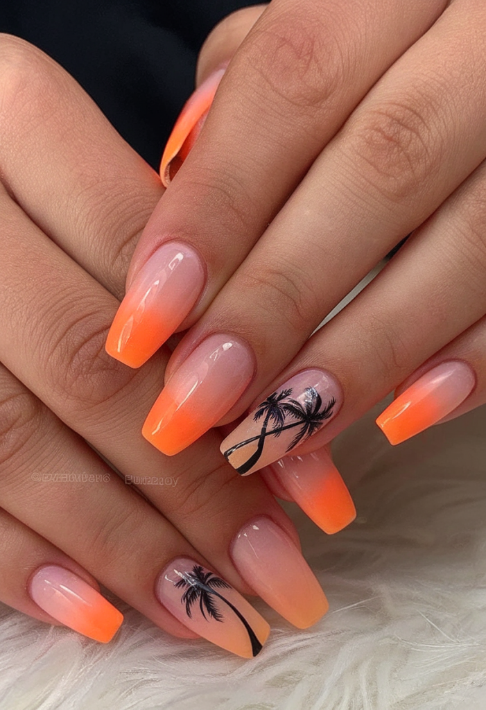 Capture golden hour in your manicure with this dreamy blend of coral and peach tones overlaid with black palm silhouettes. The coffin nail shape adds drama, and the art reflects World styles seen in tropical destinations like Bali or the Caribbean. A perfect marriage of wanderlust and 2025 trends.