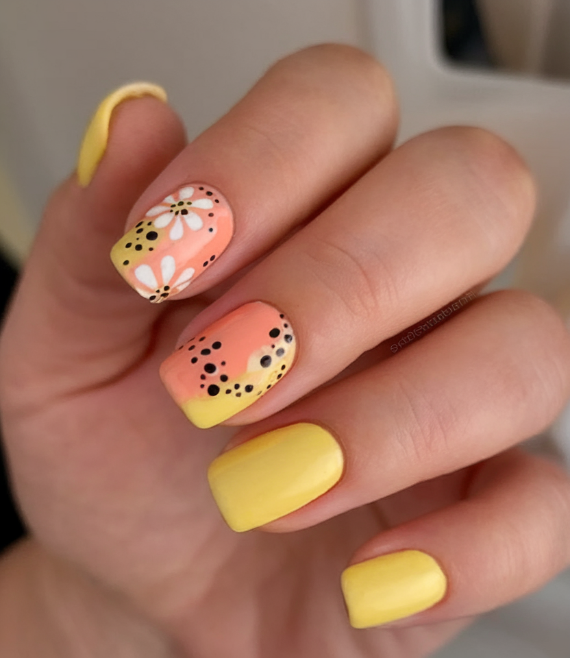 Lemon yellow meets tangerine in this cheerful design, with accent nails decorated in daisies and black polka dots. The short nails and square shape make this look super easy to wear, while the fun ideas are perfect for brunch dates or backyard barbecues. It’s a bright choice that still feels cute and lighthearted.