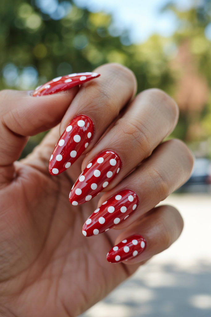 Vintage glamour is the main attraction in this retro red polka dot design. A touch of sass comes from the white dots on the red gel polish against the gel base. Any summer party will be perfect for this ensemble when paired with retro hairstyles or sunglasses.