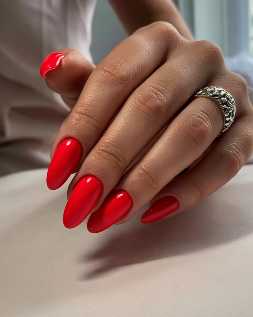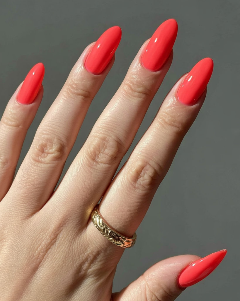 Almond-shaped nails draw attention with their high-gloss quality and red gel polish for full-body shine. This nail shape elongates the fingers for an attractive look, making it suitable for strong summer looks. The traditional nail design achieves power status when paired with gold embellishments or a full red ensemble. The nail style works well for people who embrace bright color choices due to its clean and editorial final look.
