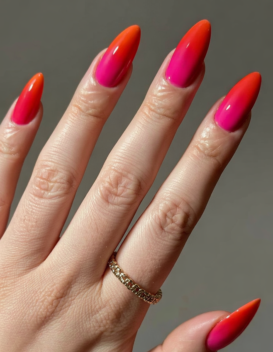 This bold ombré creation perfectly blends hot pink with fiery orange in a seamless transition. This design is an energetic version of the Inspo 2025 trend. Each nail has a soft fade effect, making this an ideal choice for people who like their nails to be just as enthusiastic about summer events.