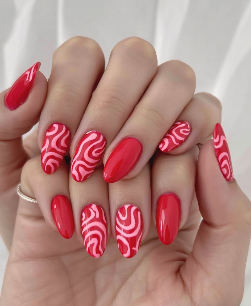 The funky graphic artwork consists of bubblegum pink swirling lines against a cherry background. The playful and trendy look appeals to individuals who enjoy being creative with their nail decoration. Take to Instagram with mirrored glasses paired with a white crop top.