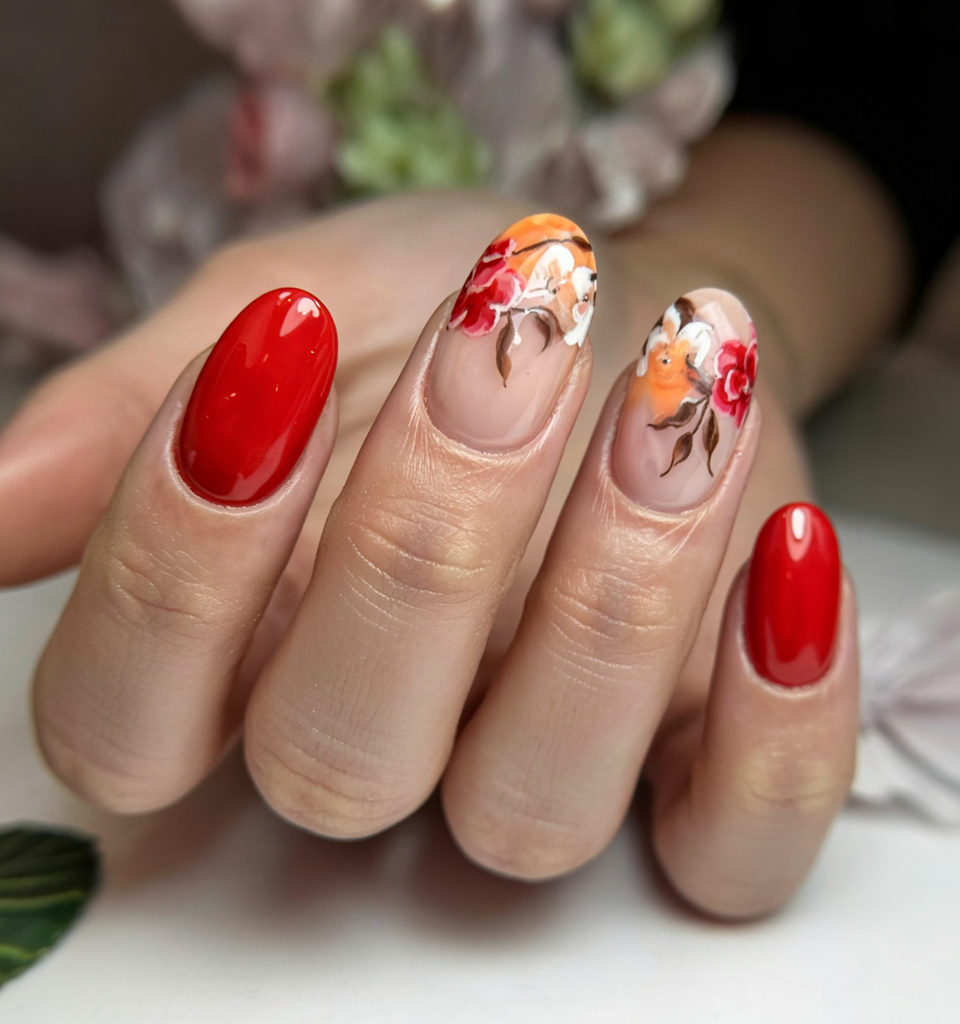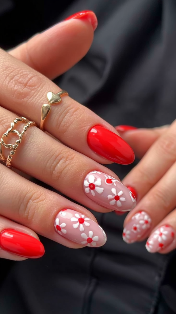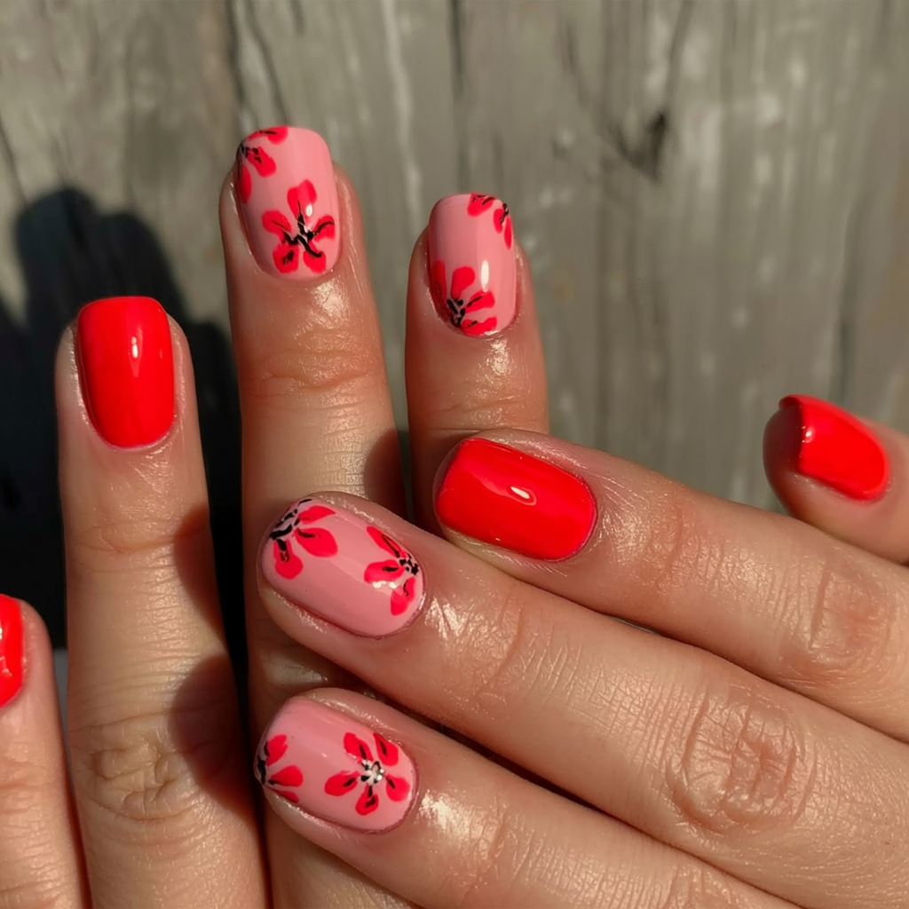 The nail design shows a back and forth presentation of full red gel nails together with pink nails decorated with bold red flowers. The sharp contrast makes this design visually appealing as the oval nail style is combined with a youthful appeal. The fresh floral design offers a fresh approach to summer trends while providing an easy nail care solution for this season.
