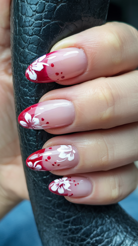 The design features a soft oval shape combined with free-spirited embellishments. The floral art blends delicate daisy shapes with bold bright red gel polish while maintaining transparency in the base. People who want a combination of fun and attractive styles will find this ideal. The nail design combines fresh elements with romantic sophistication and goes well with breezy beach adventures and fresh flower arrangements.