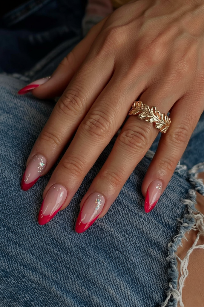This dreamy version of the French Tip design combines a delicate pink nail base with dazzling red points covered in glitter. This type of manicure offers a glamorous look for formal dates by adding sparkling accents without going overboard. The dip-like finish produces a long-lasting, glossy result.