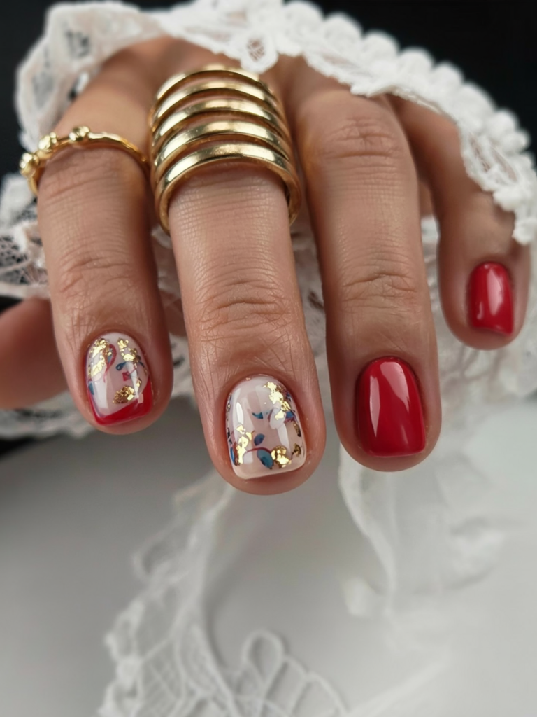 This short nail design creates a perfect fusion of vibrant red OPI nail polish with floral details and metallic foil to achieve minimalist elegance. The square structure lends a modern flair, while the gold elements add a luxurious feel. Wear with lace or linen for elegant sophistication.