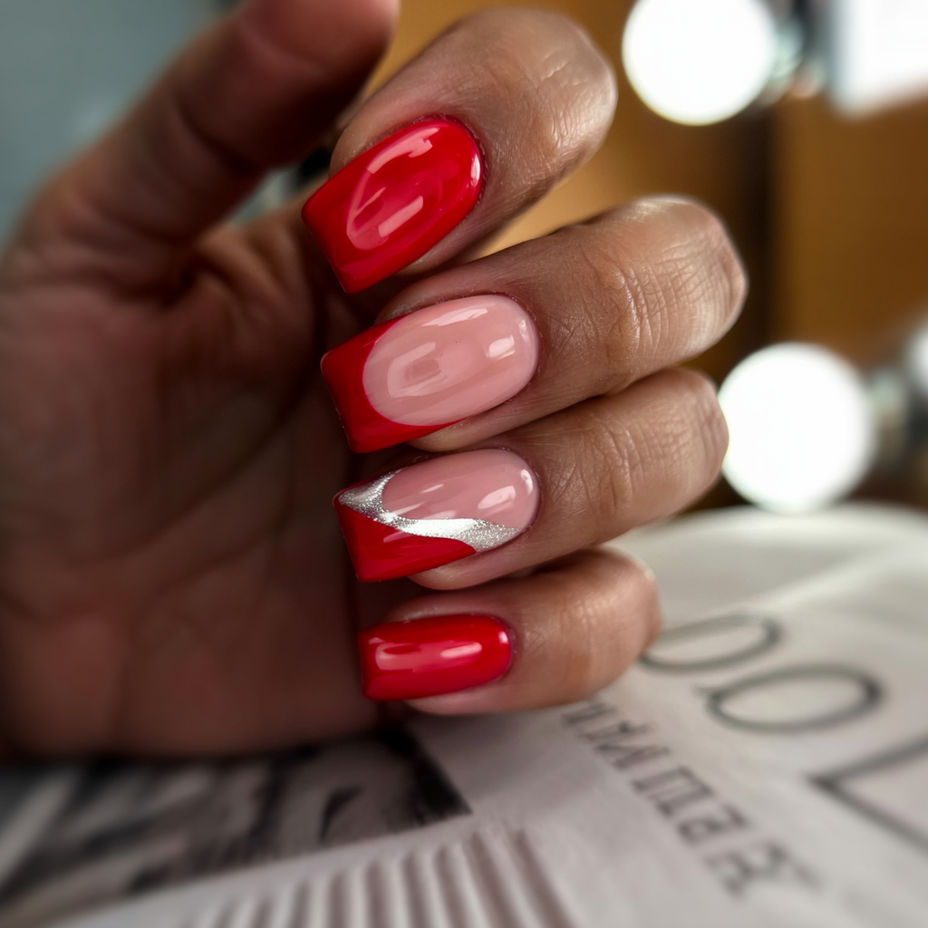 The square-shaped nails in this set combine bold sophistication with a squared-off structure and modern French tips. The polished nails feature vibrant red designs combined with nude bases that showcase a bold red edge effect and are further enhanced by the delicate metallic silver flourish. People who enjoy established manicures plus artistic elements will love this top-of-the-line gel design. Wear this ensemble with a tailored blazer paired with a statement ring for a power look.